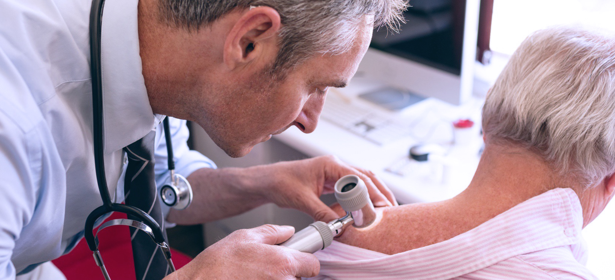 - Dry pigmented papules or patches mainly in chronically sun-exposed skin areas.