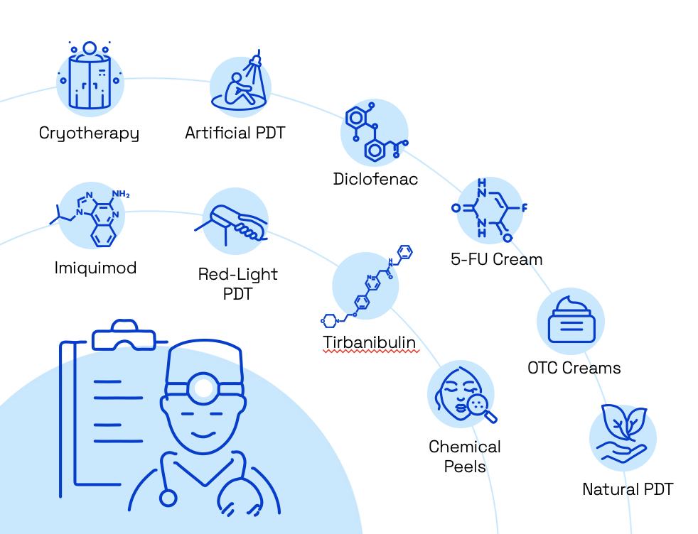All of the available care avenues suffer from efficacy, tolerability or access shortcomings, with exceptionally high recurrence rates. Morton et al. 2023. "Expert Recommendations on Facilitating Personalized Approaches to Long-term Management of Actinic Keratosis: The Personalizing Actinic Keratosis Treatment (PAKT) Project." Acta Derm Venereol 103: adv6229
